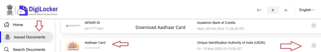 • Download e-Aadhaar: Once verified, your e-Aadhaar PDF will appear under the “Issued Documents” section. Click the download icon to save it securely on your device.